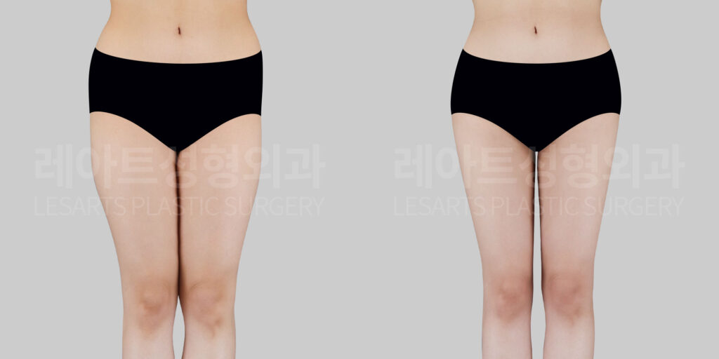 [Before-and-after comparison of thigh liposuction]