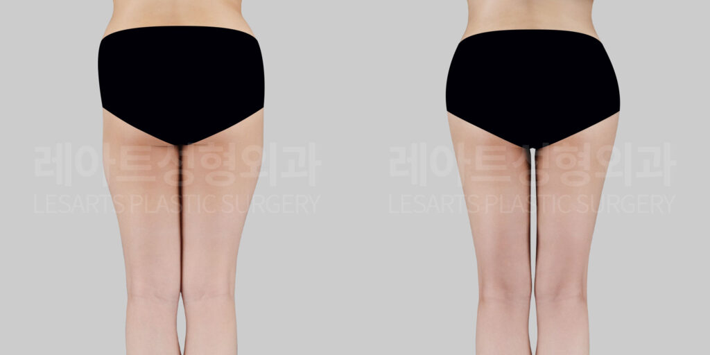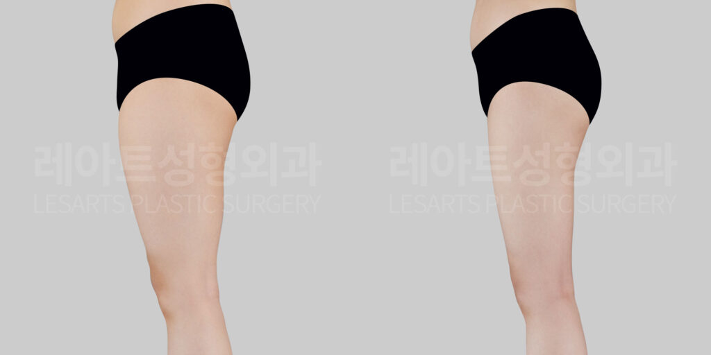 Before-and-after comparison of thigh liposuction and hip dip fat transfer at Lesarts